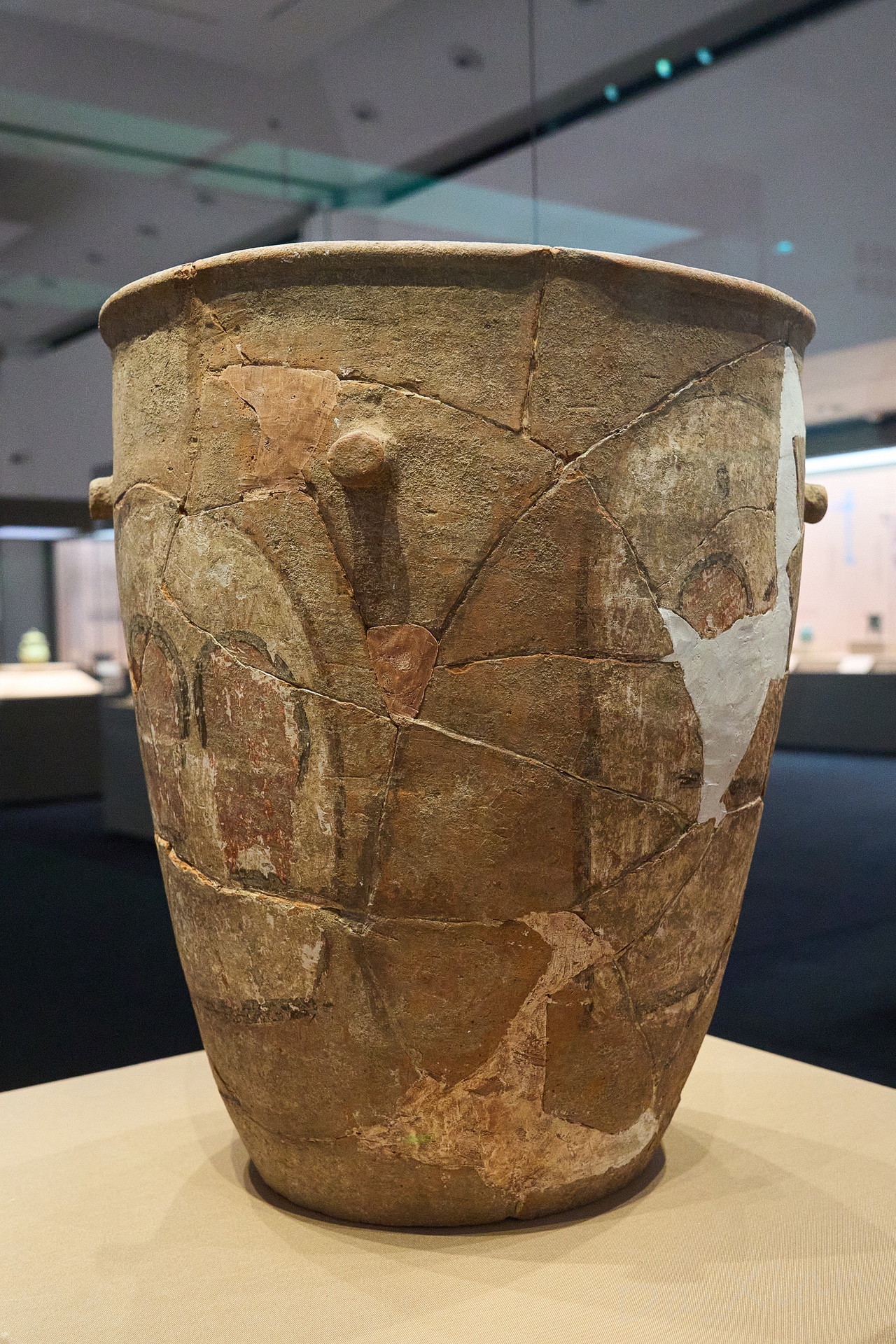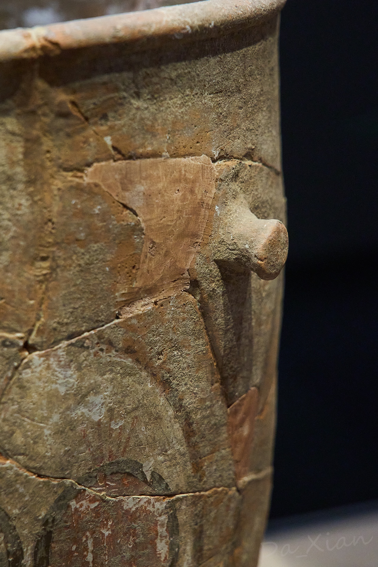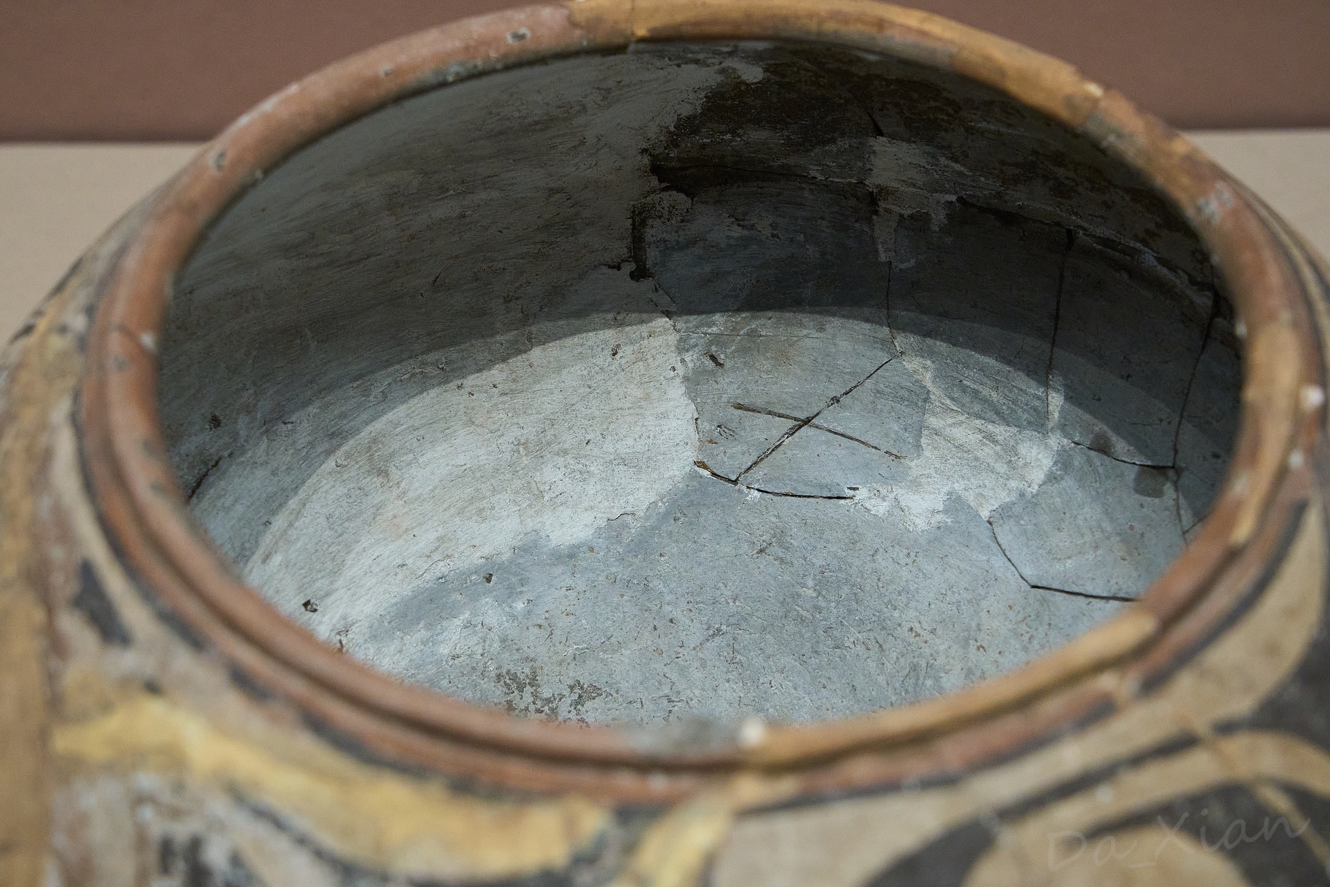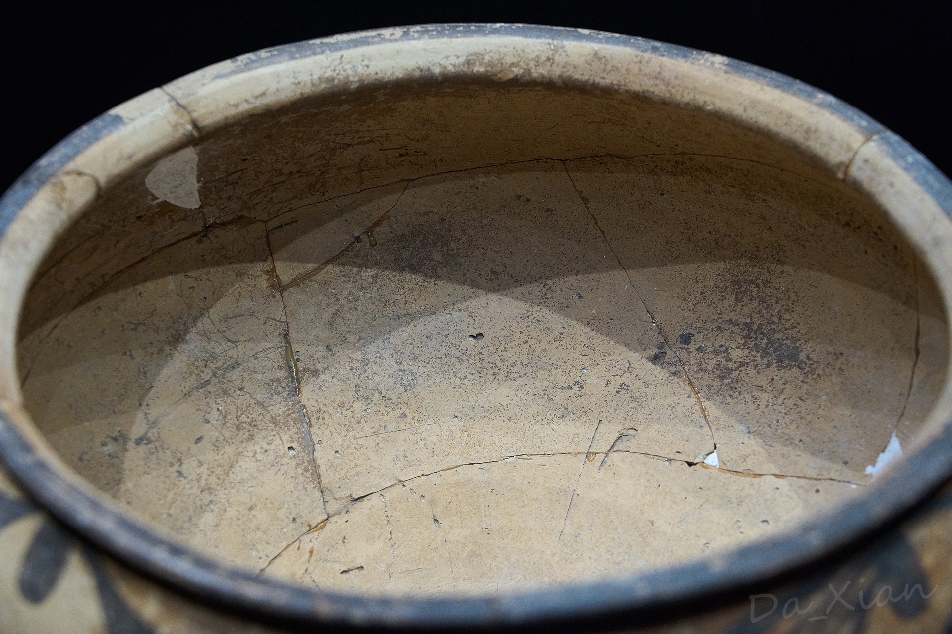 此陶缸为仰韶文化瓮棺葬具的代表类型,属于“伊川缸”系统。其造型规整浑厚,口沿外敞、微卷,直壁渐收,平底稳重,口沿下方对称饰有泥凸,兼具实用与装饰功能。器身通体饰大面积彩绘,先以黑彩勾勒图案轮廓,再以白、红二彩平涂填充,色彩对比鲜明,纹样古朴而富有韵律,反映出仰韶中晚期彩陶绘制技艺的高超水平。该器出土于汝州洪山庙遗址 M1 墓葬,该墓是迄今所见仰韶文化规模最大的瓮棺合葬墓,墓中绝大多数瓮棺表面均饰彩绘。此类葬具在绘制纹样后,会经打磨处理再入窑焙烧,使彩绘与陶衣紧密结合,不易剥落,体现出当时陶工在材料处理与工艺控制上的成熟智慧。
