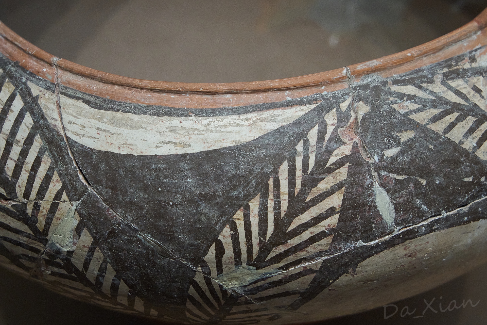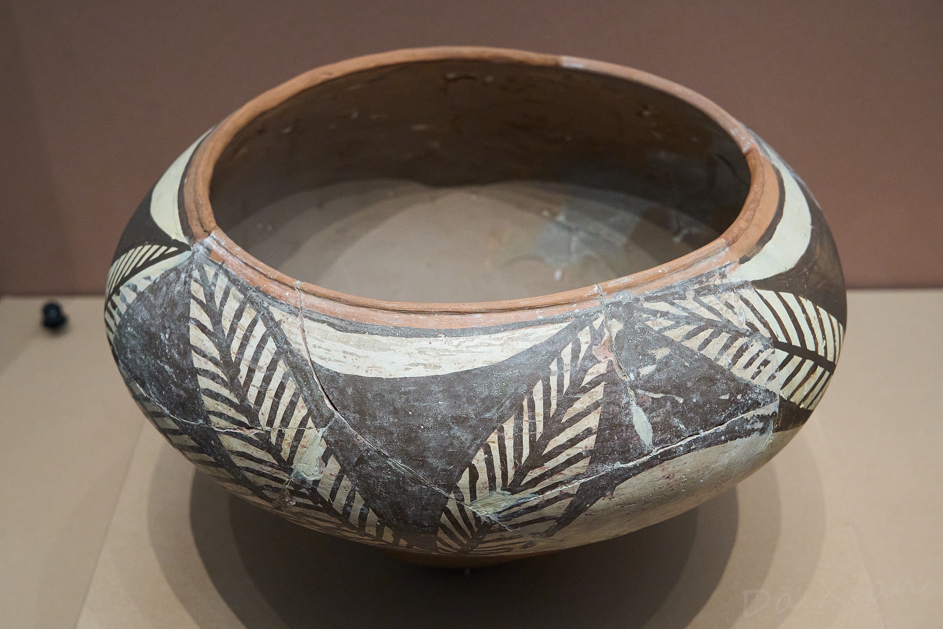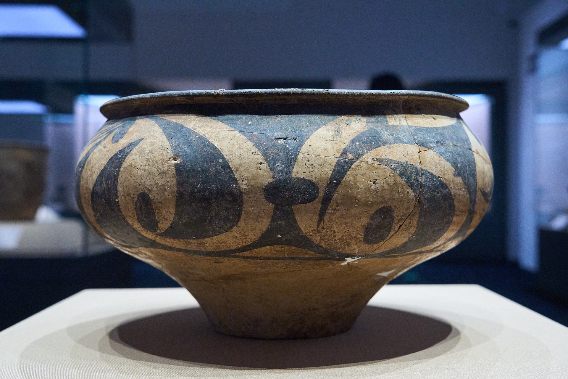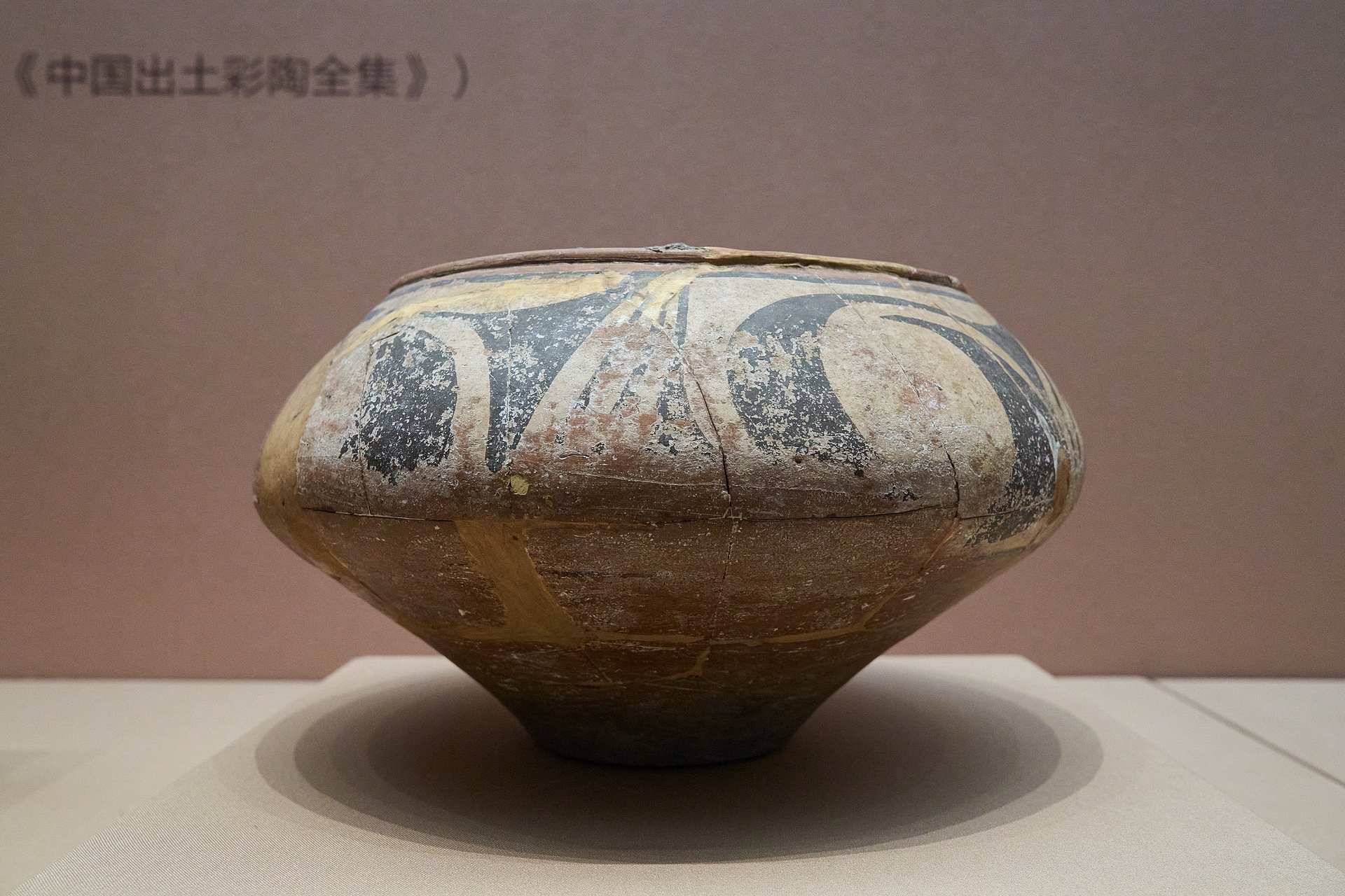 此陶缸为仰韶文化瓮棺葬具的代表类型,属于“伊川缸”系统。其造型规整浑厚,口沿外敞、微卷,直壁渐收,平底稳重,口沿下方对称饰有泥凸,兼具实用与装饰功能。器身通体饰大面积彩绘,先以黑彩勾勒图案轮廓,再以白、红二彩平涂填充,色彩对比鲜明,纹样古朴而富有韵律,反映出仰韶中晚期彩陶绘制技艺的高超水平。该器出土于汝州洪山庙遗址 M1 墓葬,该墓是迄今所见仰韶文化规模最大的瓮棺合葬墓,墓中绝大多数瓮棺表面均饰彩绘。此类葬具在绘制纹样后,会经打磨处理再入窑焙烧,使彩绘与陶衣紧密结合,不易剥落,体现出当时陶工在材料处理与工艺控制上的成熟智慧。