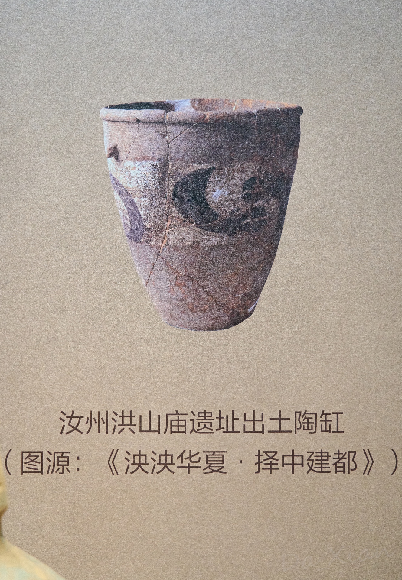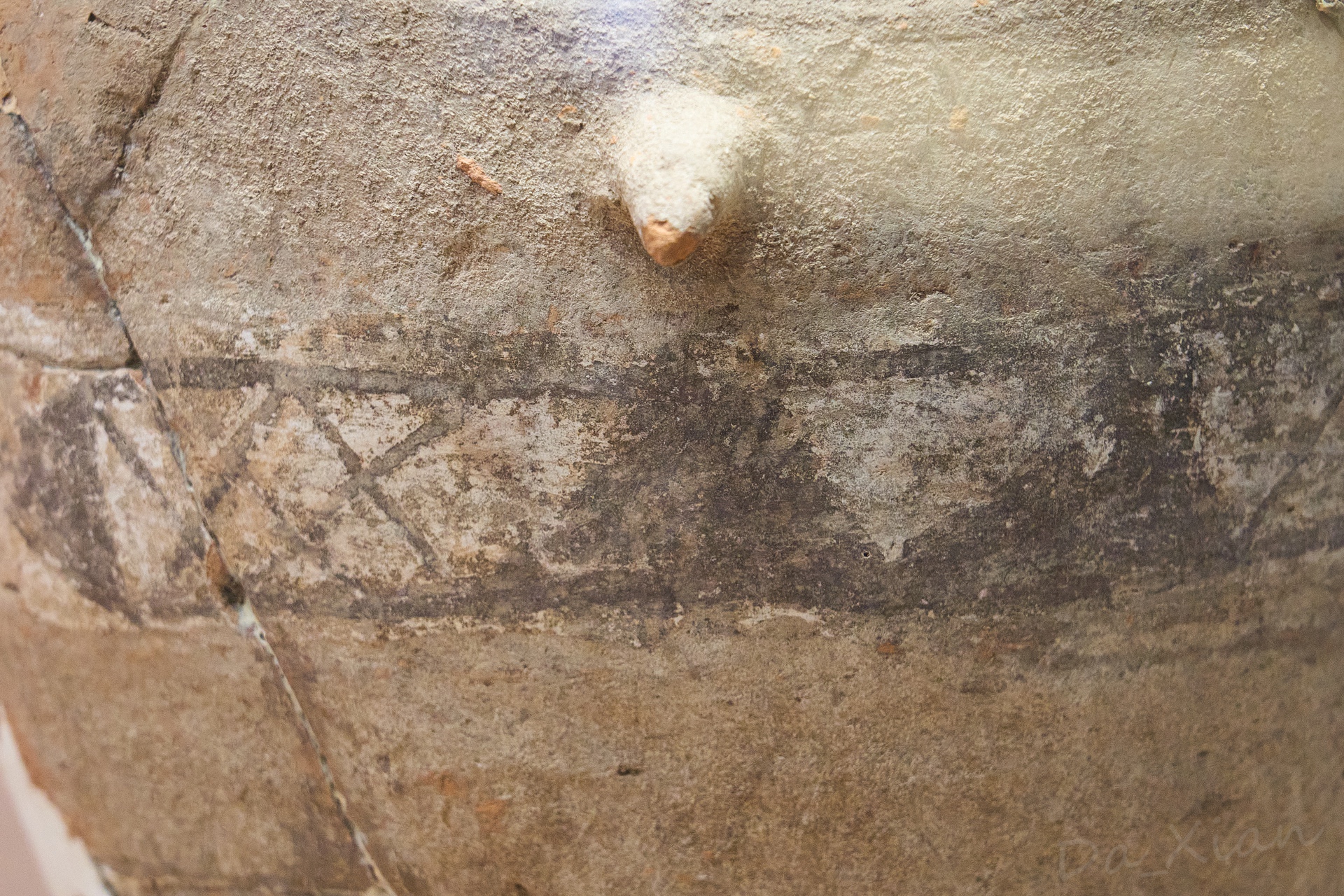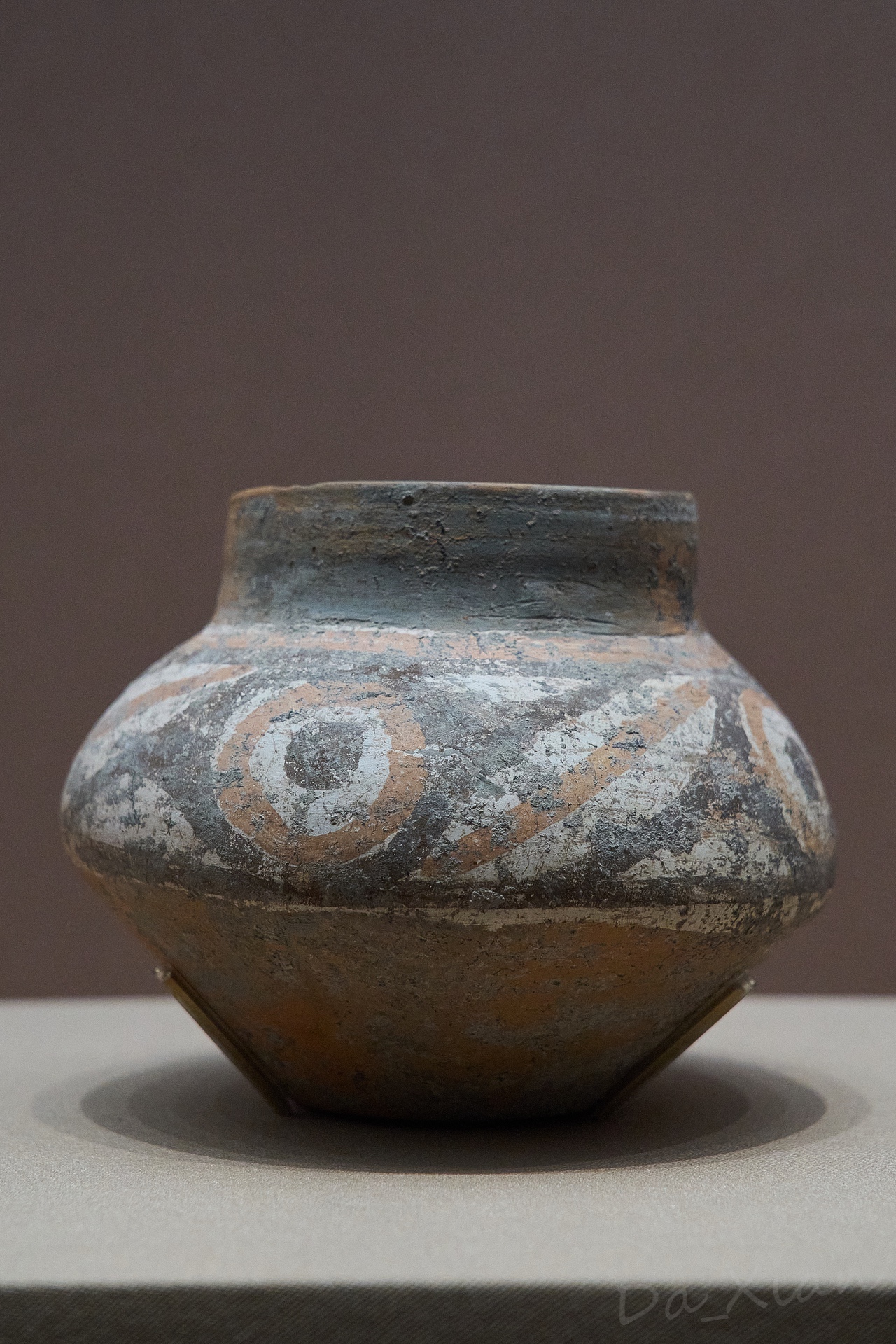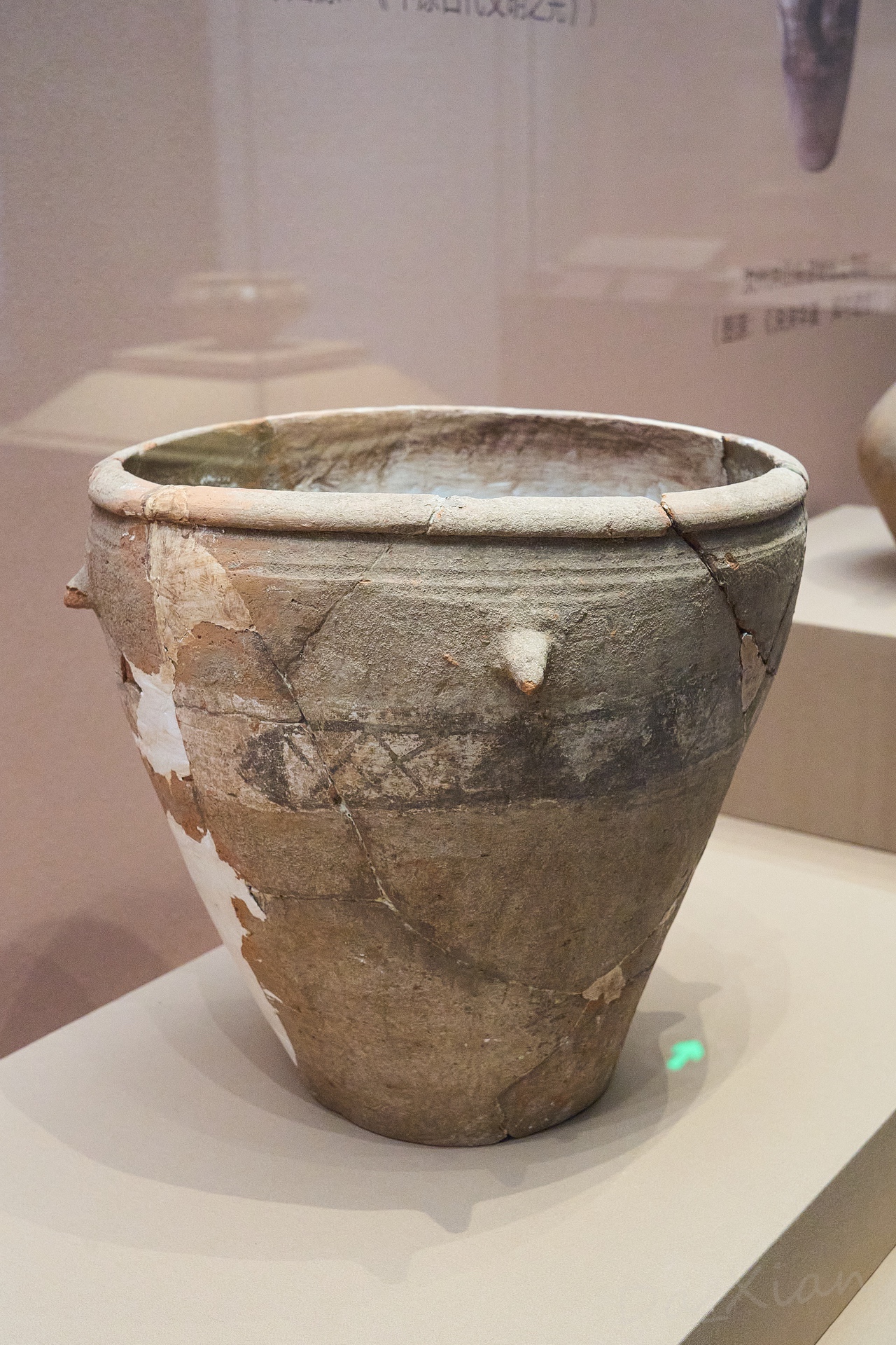 此陶缸为仰韶文化瓮棺葬具的代表类型,属于“伊川缸”系统。其造型规整浑厚,口沿外敞、微卷,直壁渐收,平底稳重,口沿下方对称饰有泥凸,兼具实用与装饰功能。器身通体饰大面积彩绘,先以黑彩勾勒图案轮廓,再以白、红二彩平涂填充,色彩对比鲜明,纹样古朴而富有韵律,反映出仰韶中晚期彩陶绘制技艺的高超水平。该器出土于汝州洪山庙遗址 M1 墓葬,该墓是迄今所见仰韶文化规模最大的瓮棺合葬墓,墓中绝大多数瓮棺表面均饰彩绘。此类葬具在绘制纹样后,会经打磨处理再入窑焙烧,使彩绘与陶衣紧密结合,不易剥落,体现出当时陶工在材料处理与工艺控制上的成熟智慧。