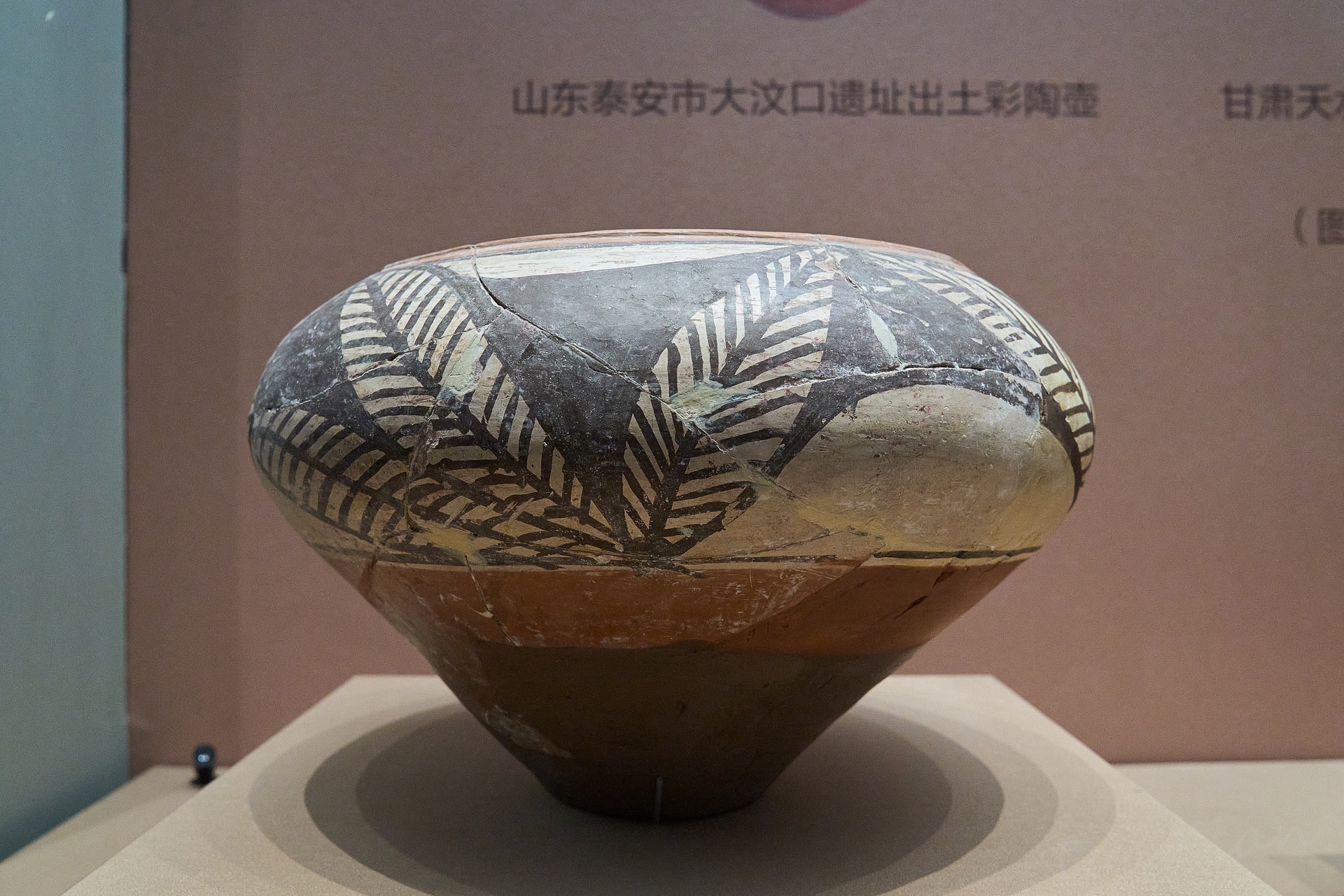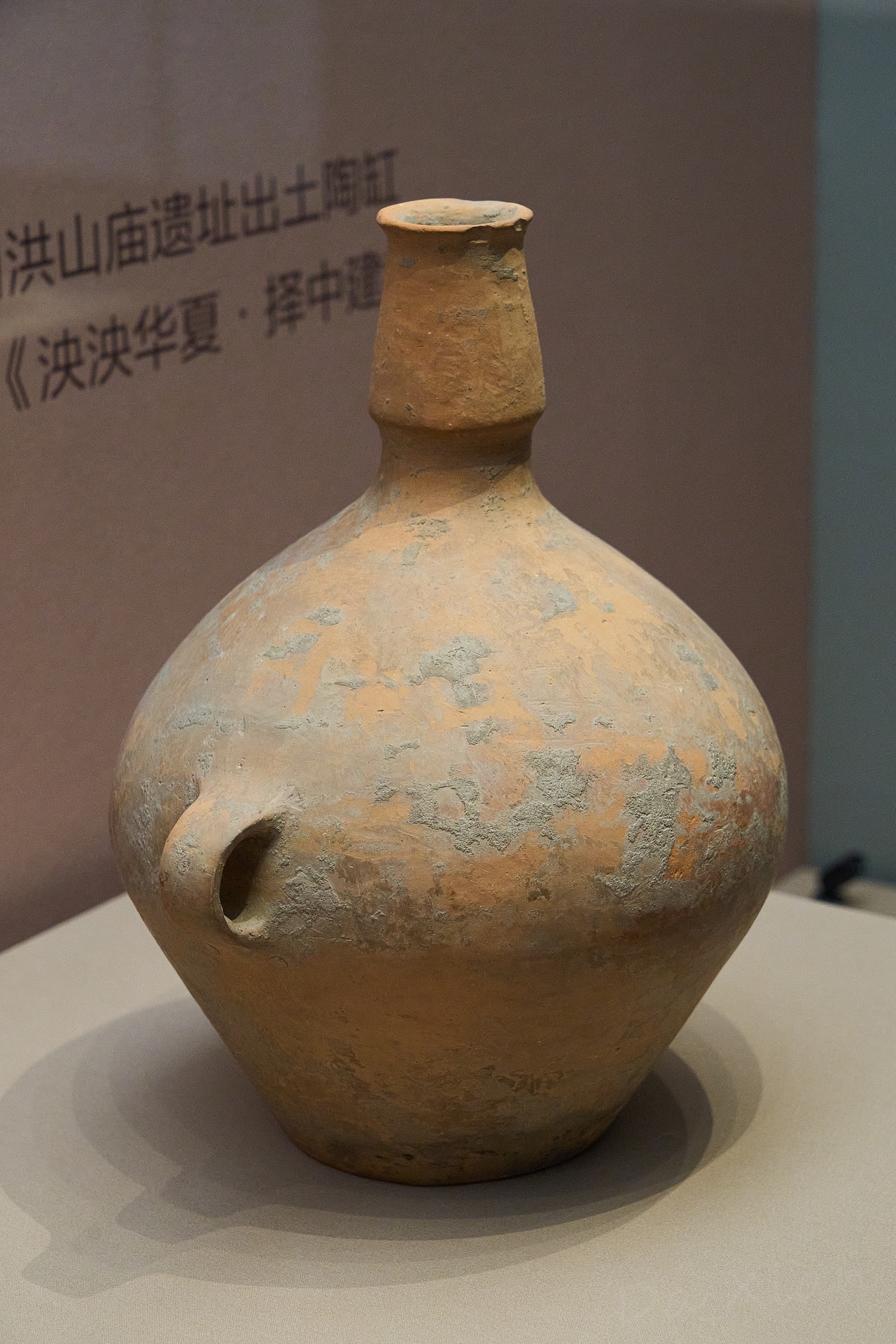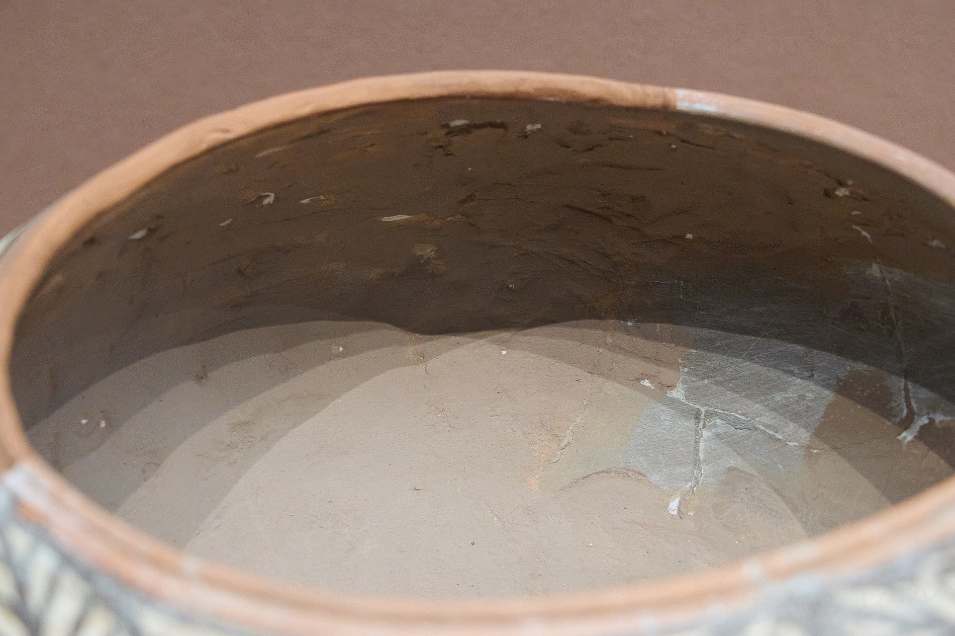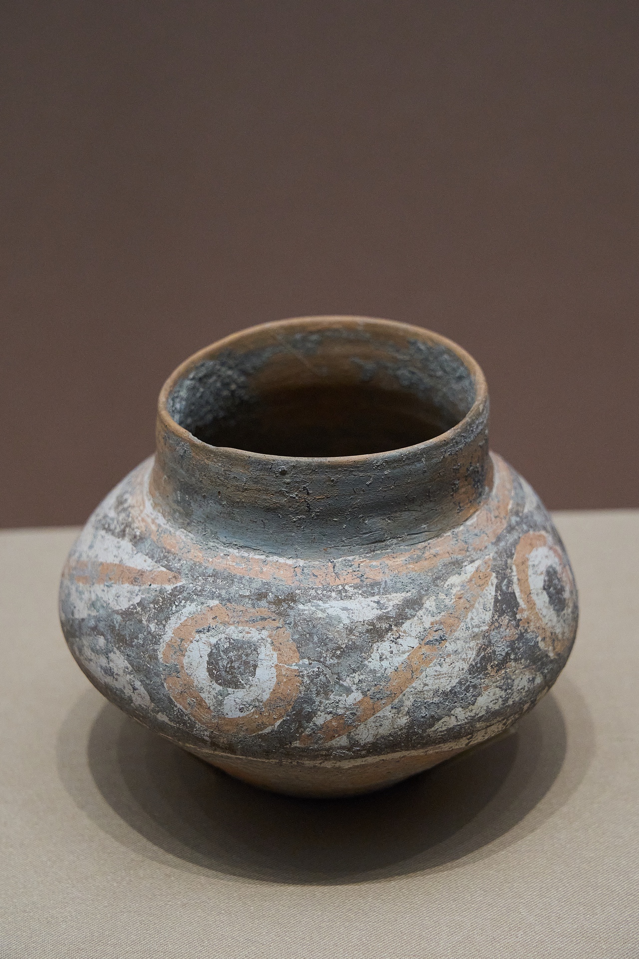 此陶缸为仰韶文化瓮棺葬具的代表类型,属于“伊川缸”系统。其造型规整浑厚,口沿外敞、微卷,直壁渐收,平底稳重,口沿下方对称饰有泥凸,兼具实用与装饰功能。器身通体饰大面积彩绘,先以黑彩勾勒图案轮廓,再以白、红二彩平涂填充,色彩对比鲜明,纹样古朴而富有韵律,反映出仰韶中晚期彩陶绘制技艺的高超水平。该器出土于汝州洪山庙遗址 M1 墓葬,该墓是迄今所见仰韶文化规模最大的瓮棺合葬墓,墓中绝大多数瓮棺表面均饰彩绘。此类葬具在绘制纹样后,会经打磨处理再入窑焙烧,使彩绘与陶衣紧密结合,不易剥落,体现出当时陶工在材料处理与工艺控制上的成熟智慧。