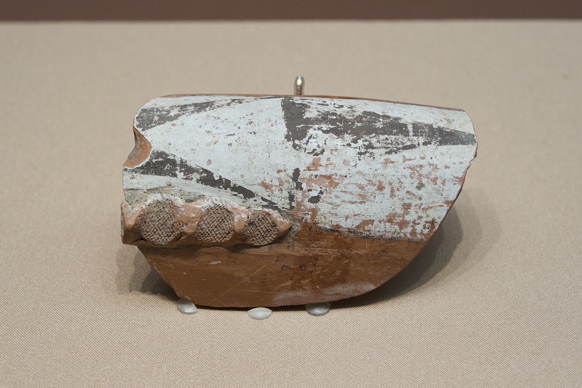 此彩陶片为仰韶文化时期典型器物之残件,胎体质朴,呈红褐色,表面施乳白色陶衣,其上以褐彩绘几何纹样,纹路清晰,笔触流畅。尤为值得注意的是,白色饰带下沿饰有附加堆纹,堆纹表面粘连清晰的织布痕迹,纹路细密均匀。布纹的出现,是仰韶文化时期纺织技术发展的重要实物证据,表明当时已具备一定水平的纺线织布能力。