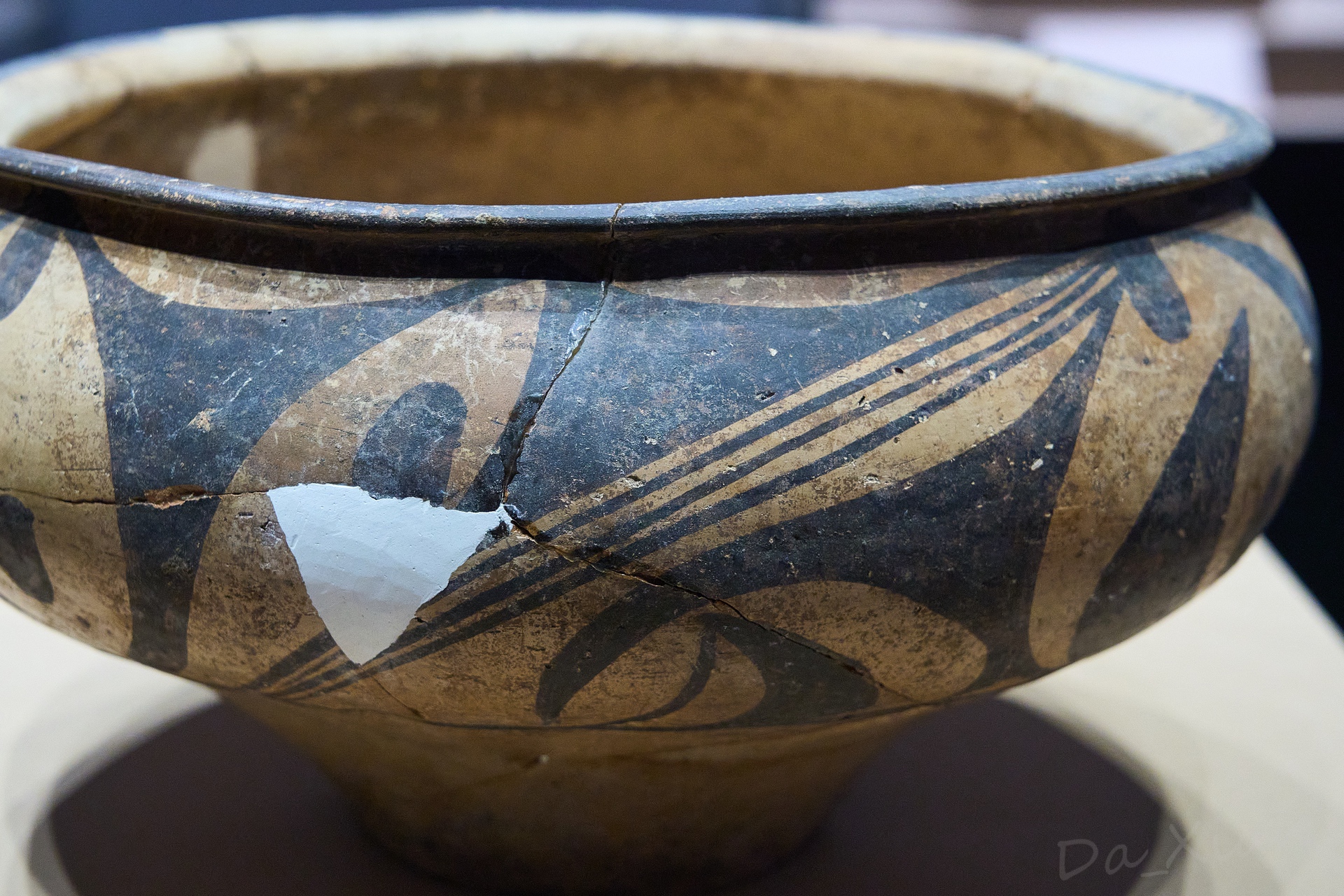 该器出土于郑州后庄王遗址,属于仰韶文化中晚期代表性器物。此钵敛口,卷沿,腹部急折,下接平底,造型端庄稳重。器腹以褐彩绘饰典型的仰韶文化勾连纹,线条流畅婉转,富于韵律感。此类纹饰是从早期具象纹饰逐渐抽象、演变而来,既反映了仰韶先民对自然物象的观察与提炼,也体现了这一时期彩陶纹饰逐渐符号化、规范化的艺术发展趋势。