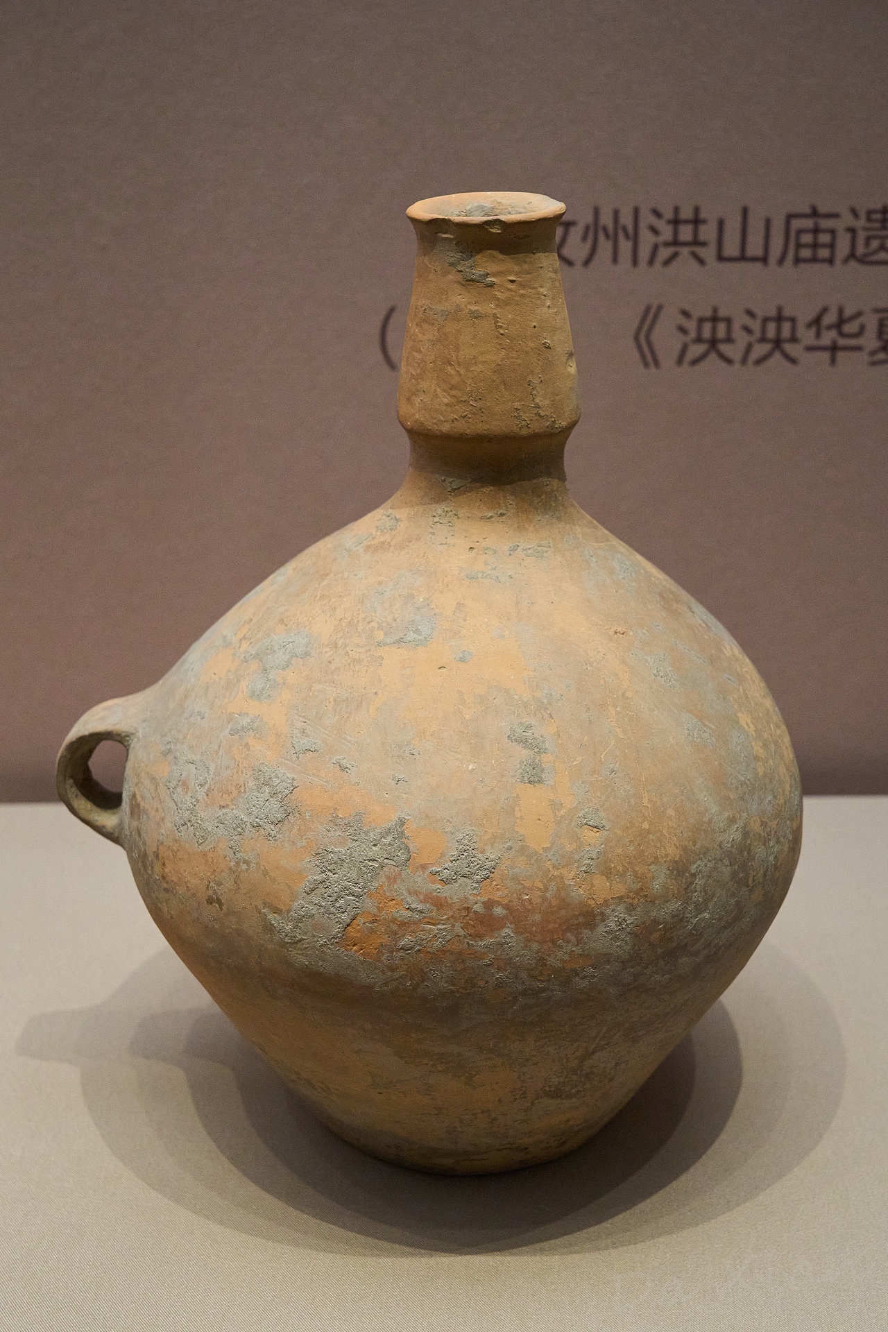 此红陶瓶为仰韶文化典型盛储器,胎体呈匀净的土红色,器表光素,色澤温润。其造型饱满而匀称,杯口微侈,短颈内束,腹部圆鼓如球,下接平底,形态浑朴中见精巧。腹侧附有一桥形单耳,耳体宽扁,弧度自然,兼具提携功能与装饰意趣。瓶身比例协调,小口利于封存内容物,鼓腹增加容量,平底保障稳定,单耳便于提运,体现了先民在日常用器设计中兼顾实用与美观的智慧。整器轮廓流畅,体量敦实,展现出仰韶陶器在造型把控与实用设计上的成熟技艺。