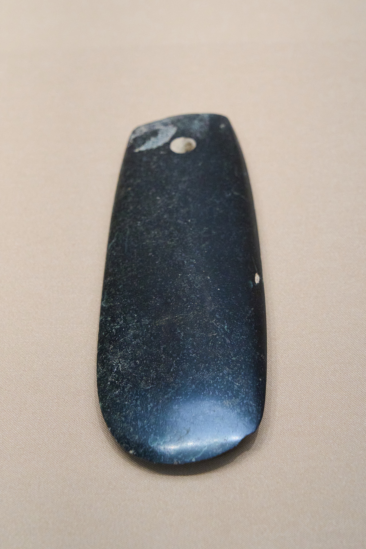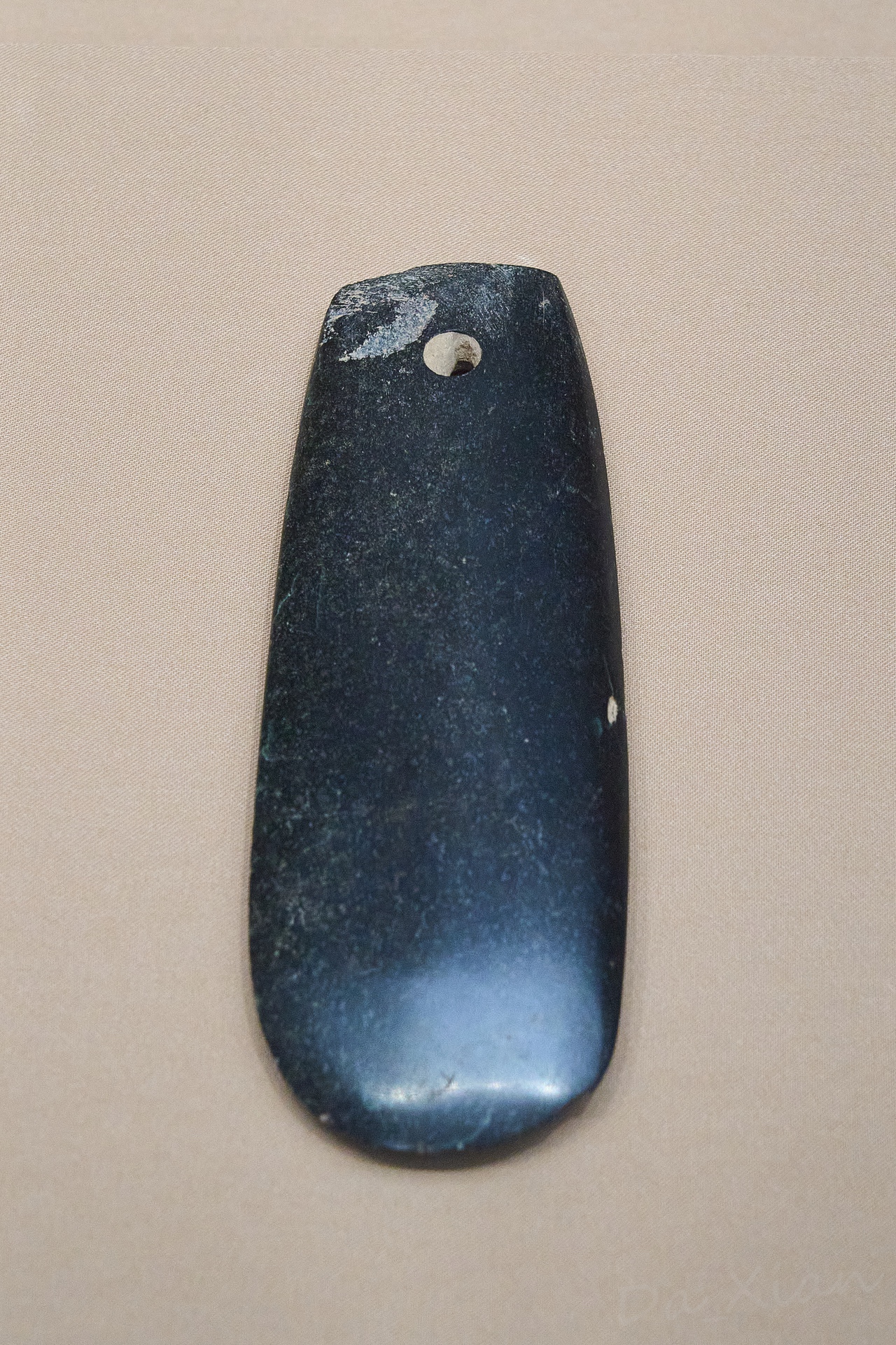 此件玉铲以墨玉制成,器体规整匀称,通体磨制光滑,质感润泽。上端有一对钻圆孔,便于系缚;刃部略薄,未见使用磨损痕迹,表明其并非日常劳动工具,而应属礼仪用器。在仰韶文化时期,玉铲已由实用工具逐渐转化为象征权力、身份或祭祀仪式的礼器。其制作工整、选料考究,折射出当时制玉工艺的进步与社会阶层分化的发展,是探索中国早期玉礼器形成的重要实物。
