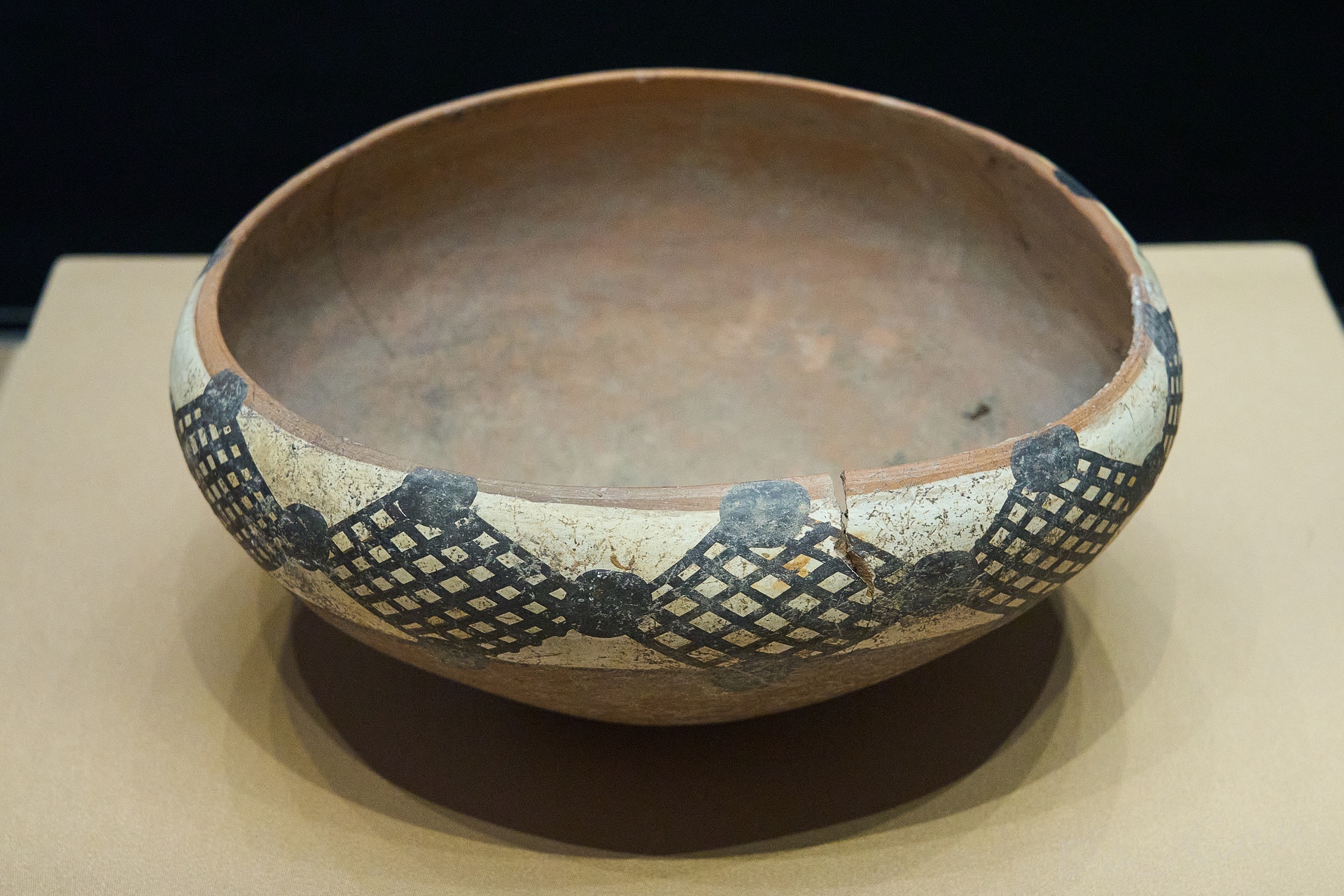此彩陶钵出土于郑州西山古城遗址——目前中原地区所见最早的史前城址之一,为仰韶文化中晚期的典型器物。其造型圆浑稳重,敛口、鼓腹、平底,器表施乳白色陶衣,并以黑彩绘饰连续而工整的网格纹。网格以直线纵横交错构成,单元清晰,排列规整,体现出鲜明的几何化装饰风格,此类纹饰可能源于对渔网、编织物等日常物象的视觉提炼,既反映了当时的生产生活形态,亦可能承载着先民对秩序与结构的原始认知。陶胎细腻,器表光润,彩绘线条匀挺,展现了仰韶文化制陶与彩绘工艺的高度成熟,其纹样之严谨与造型之端庄,映射出先民在定居农业生活中逐步形成的审美体系、空间观念与礼序意识。