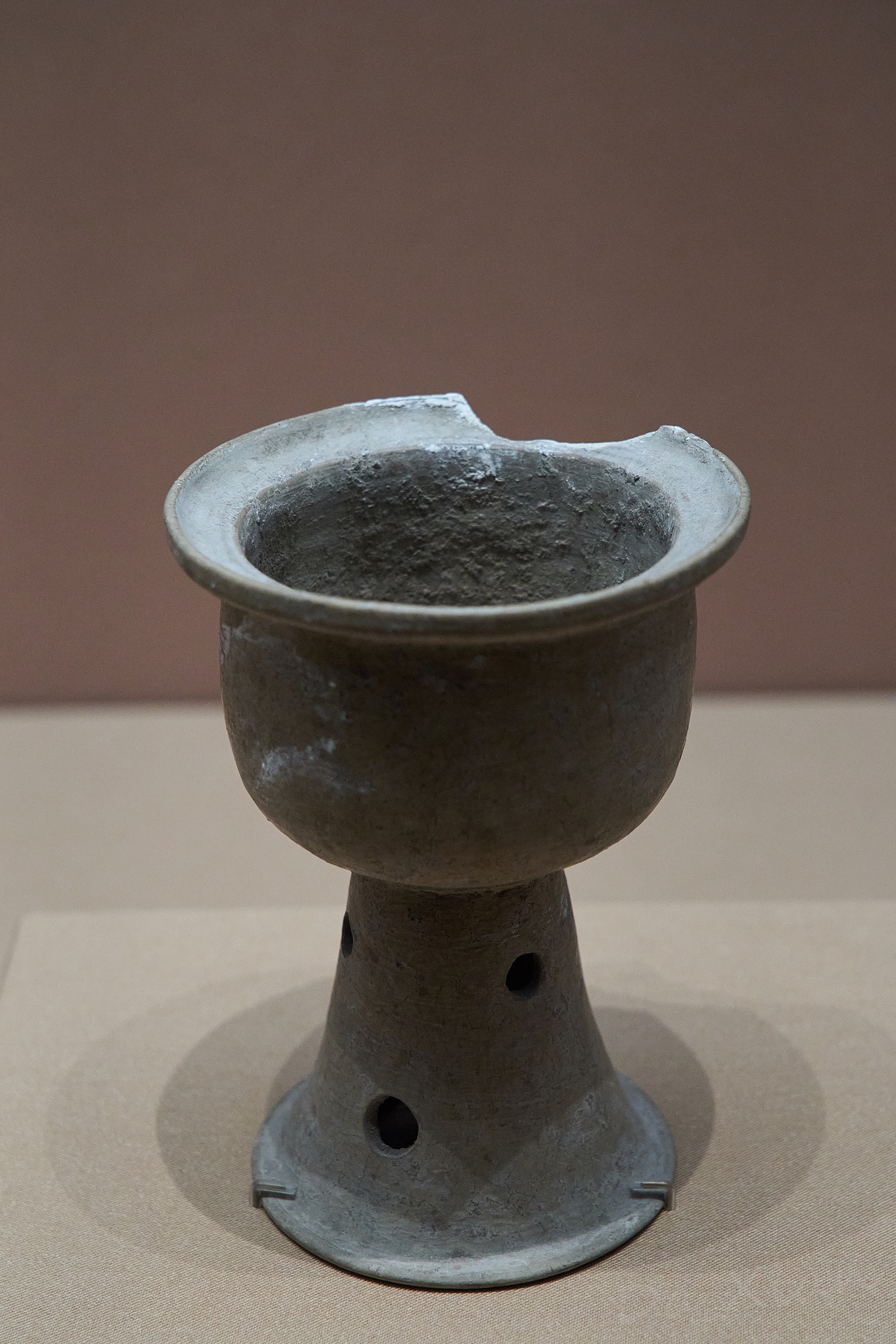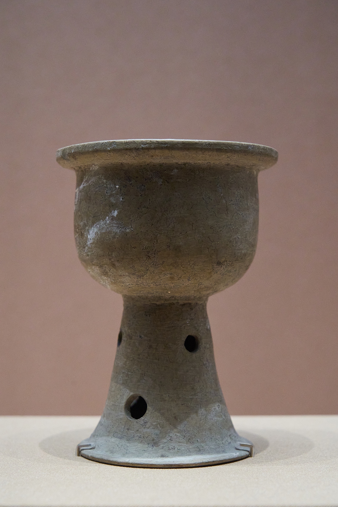 此件出土于段寨遗址的高圈足镂孔灰陶豆,为泥质灰陶,胎质细腻均匀,器表经精细打磨,素面无纹,呈现温润内敛的质感。其造型典雅挺拔:上部为盘口,直壁微鼓,呈深腹杯形;下接高挑的喇叭状圈足,足身饰上下两层圆形镂孔,下层孔径略大,布局疏朗,在减轻器重的同时,赋予整体通透的视觉节奏与灵动的空间韵律。整体线条流畅秀劲,轮廓匀称,体现了大汶口文化时期陶器在造型比例、空间经营与实用美学上的高超技艺。