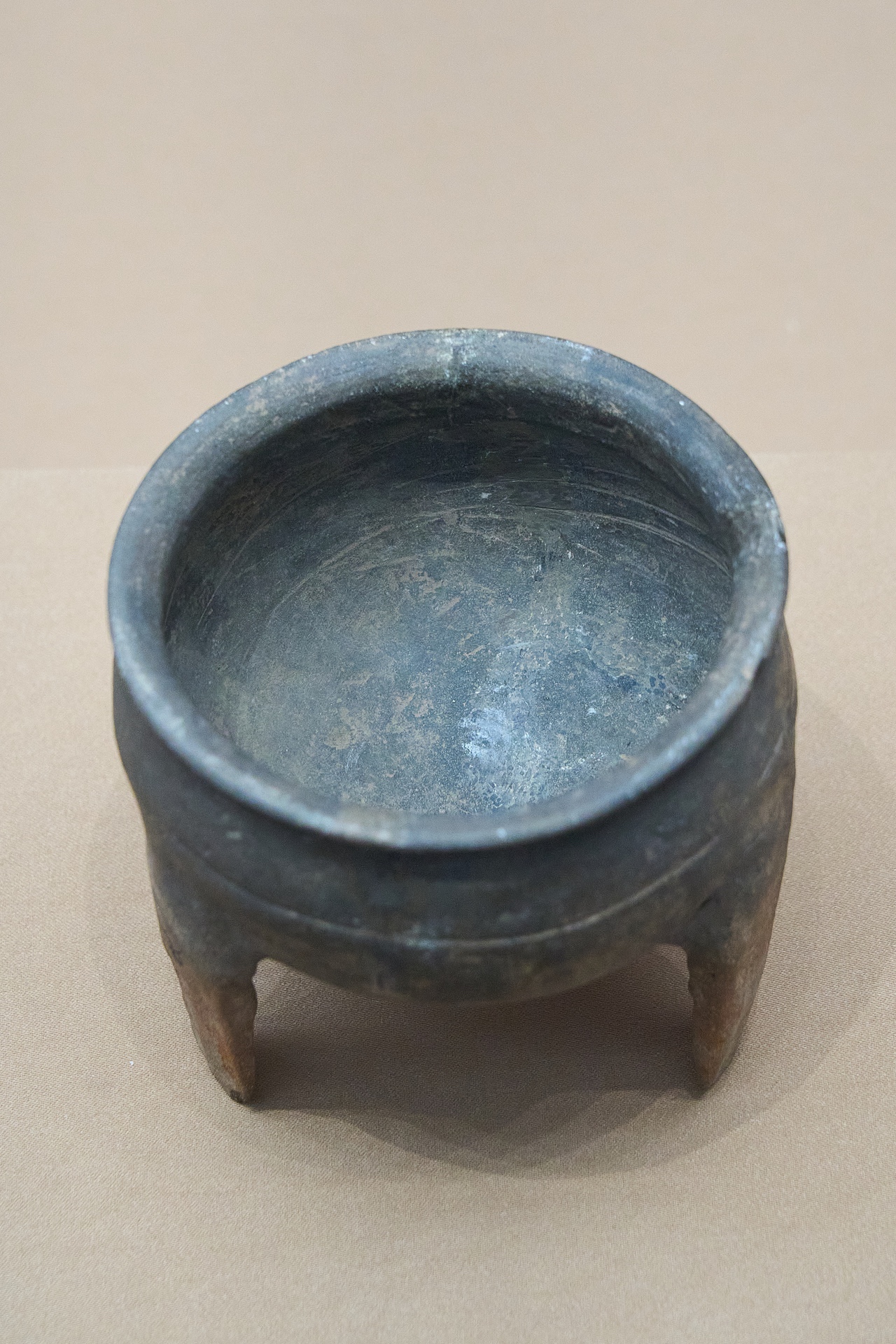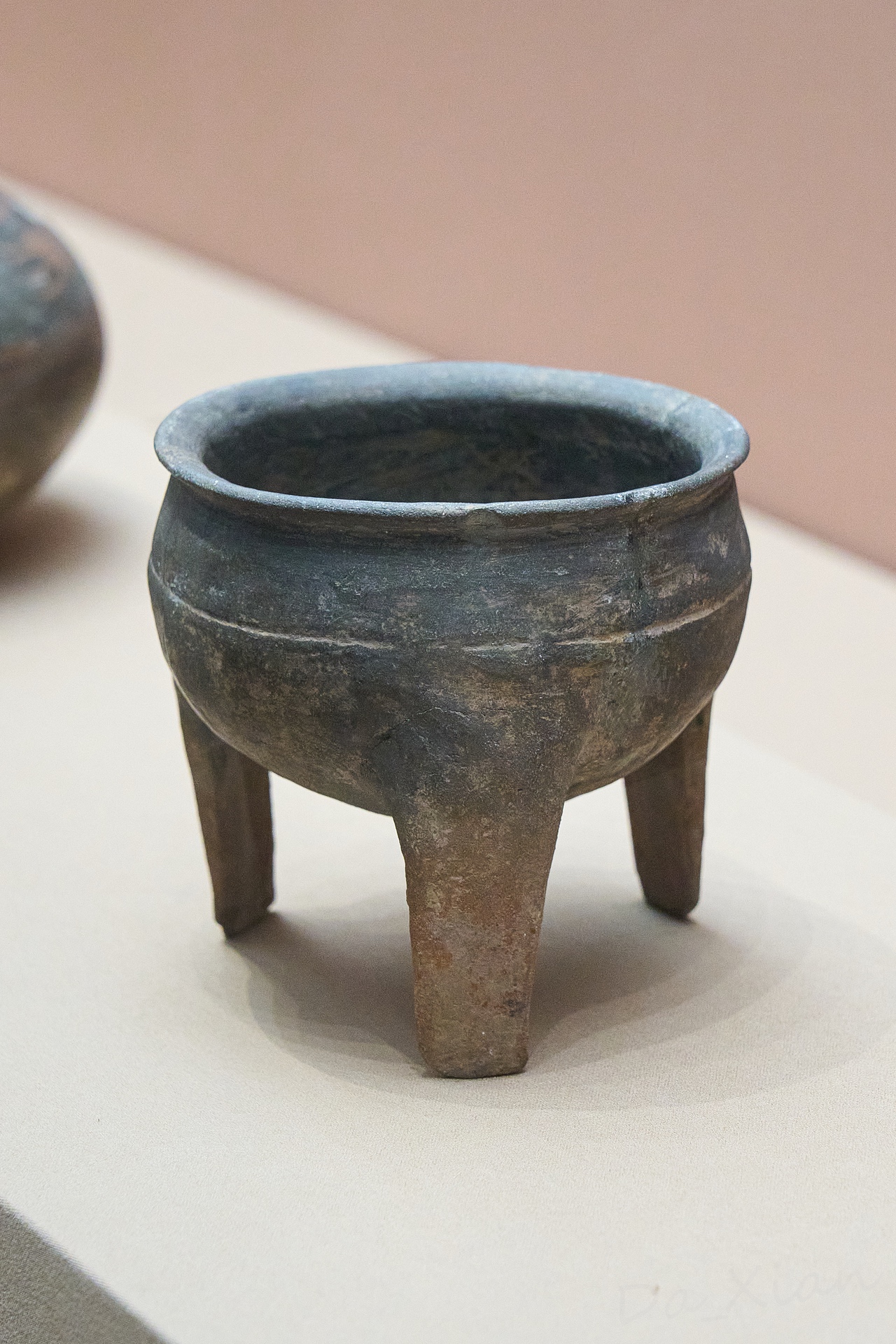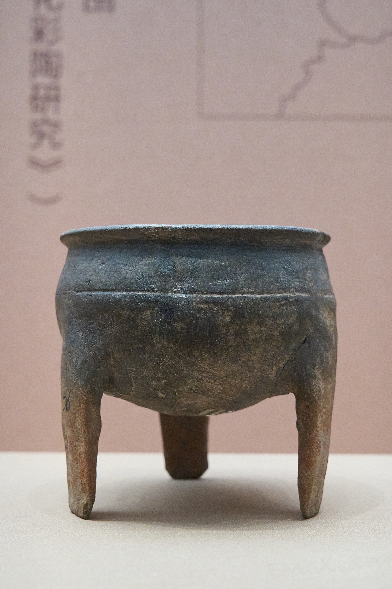 此鼎为仰韶文化时期典型炊器,陶胎呈灰褐色,整体造型浑厚质朴。侈口外敞,鼓腹圆润,下接圜底,底部承以三只扁平状实足,足部粗壮敦实,使器身稳立。通体素面无彩,仅于腹部中段饰一道浅细弦纹,于粗朴中见精微,器表保留手工抹痕与自然肌质感粗粝厚重。此类灰陶鼎是仰韶先民日常生活的真实载体,承载着煮炊、饮食乃至祭祀等多重功能。其质朴无华、重器轻饰的风格,与彩陶的绚烂形成鲜明对照,共同构成了仰韶文化陶器系统的完整面貌。